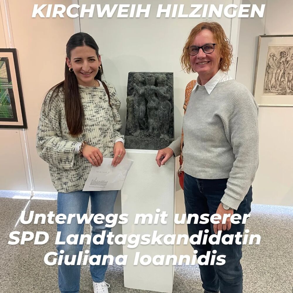 Andrea Baumann, Stellvertretende Vorsitzende der SPD Hilzingen war an Kirchweih unterwegs mit unserer Landtagskandidatin Giuliana Ioannidis. Gemeinsam besuchte man die Vernissage der Kunstausstellung "40 Jahre Jubiläumsausstellung" im August-Dietrich Saal. Anschließend ging es in den Schloßpark zur Eröffnung des neuen "Triangulus" in der Schloßparkgalerie mit 3 tollen neuen Bildtafeln, unter anderem eines von Schülern der Partnergemeinde Lizzano in Belvedere. Ein Abstecher ins Museum und abschließend ein Bummel über den Kirchweihmarkt verschafften der neuen Landtagskandidatin Giuliana Ioannidis tolle Eindrücke über und von Hilzingen.
